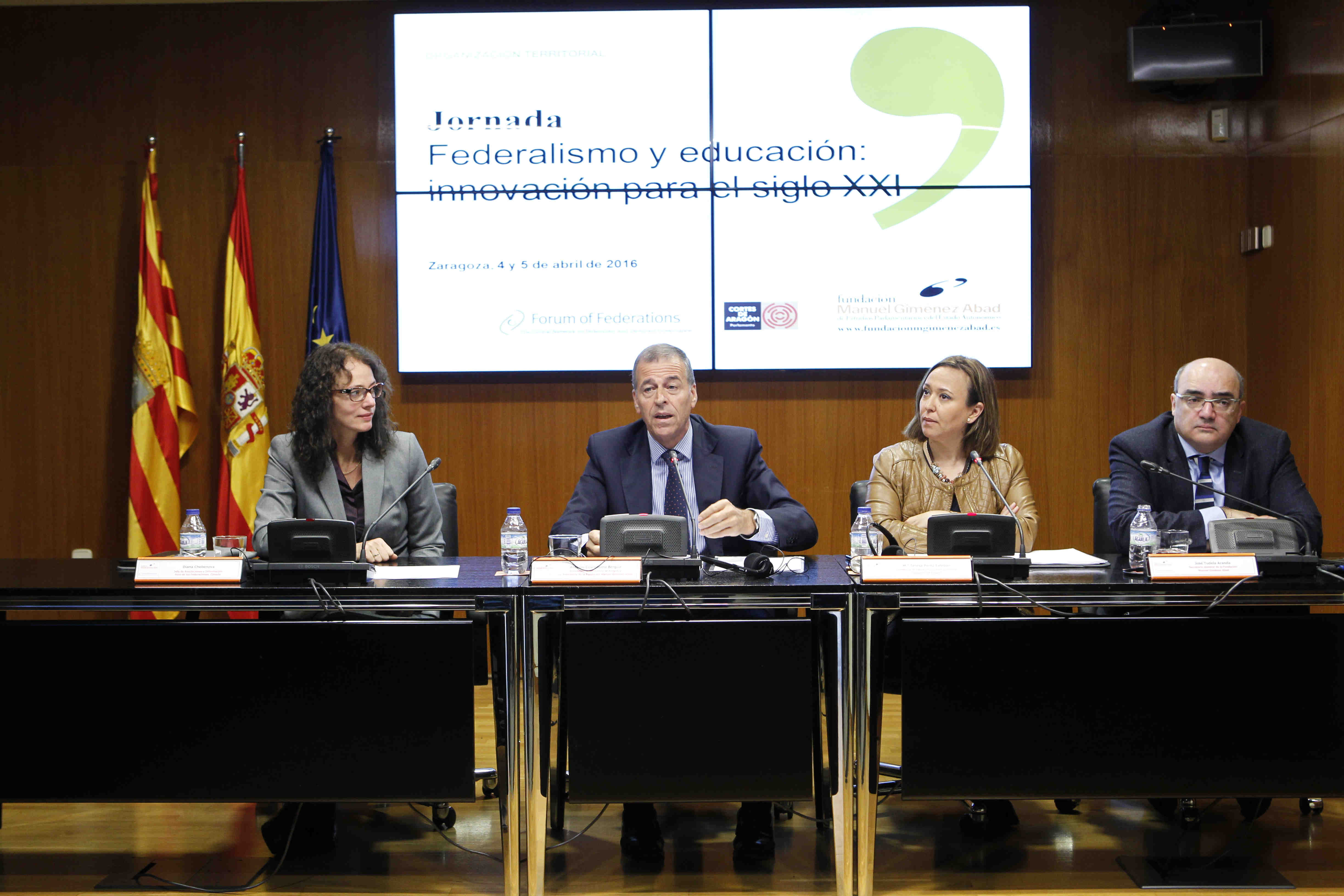 The conference was inaugurated by Jose Tudela Aranda, Secretary General of the Gimenez Abad Foundation; Diana Chebenova, Head of Partnership and Information of the Forum of Federations; Maria Teresa Perez Esteban, Minister of Education, Culture and Sport of the Government of Aragon; and Antonio Cosculluela Bergua, President of the Aragon Parliament and President of the Gimenez Abad Foundation.