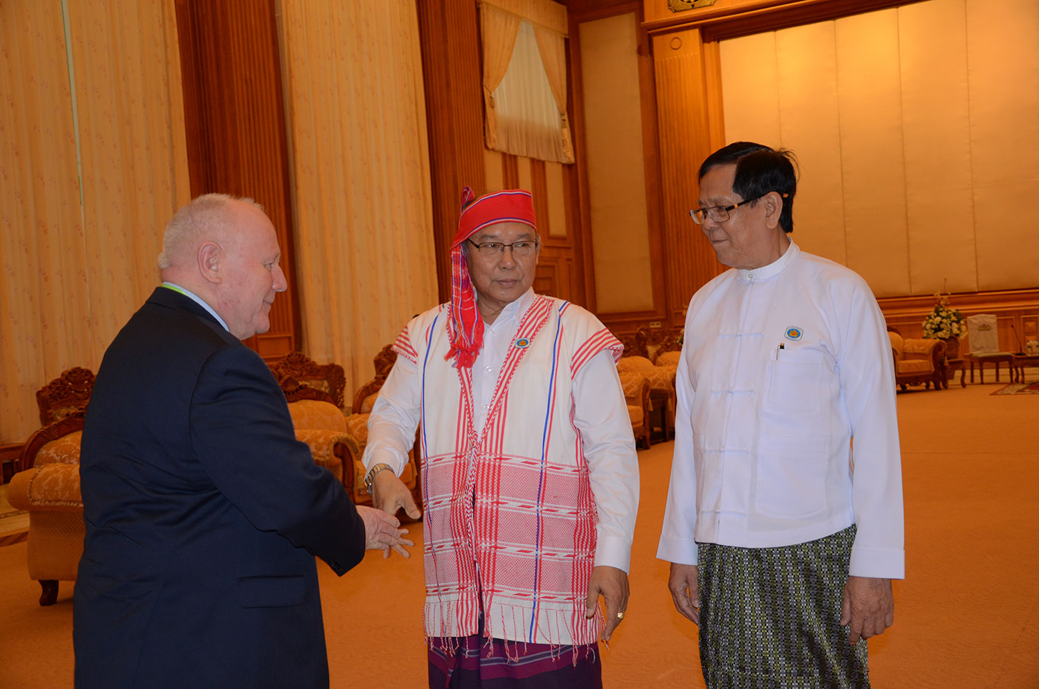 Georg Milbradt, Chairman of Board, and Hon. Bob Rae, Forum Fellow, meeting with Mahn Win Khaing Than, the Speaker of the House of Nationalities, to discuss Federalism.