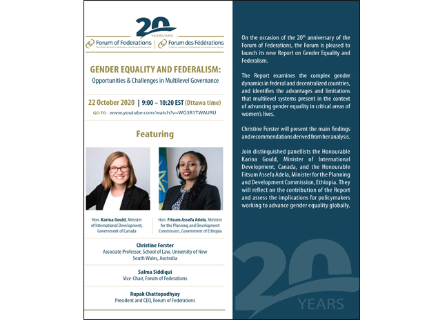 On the occasion of the 20th anniversary of the Forum of Federations, the Forum is pleased to launch its new Report on Gender Equality and