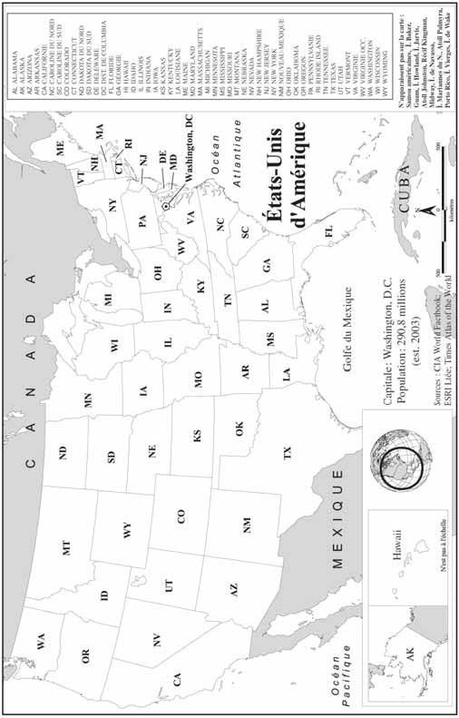 N.B. Les États-Unis d’Amérique revendiquent aussi des liens administratifs avec 2 États associés (« Federacies ») : Porto Rico, Îles Mariannes du Nord; 3 États en libre association : République des Palaos, États fédérés de Micronésie, République des îles Marshall; 3 territoires à autonomie politique locale; 3 « territoires non incorporés »; et 130 nations autochtones américaines (« Domestic Dependant Nations »)