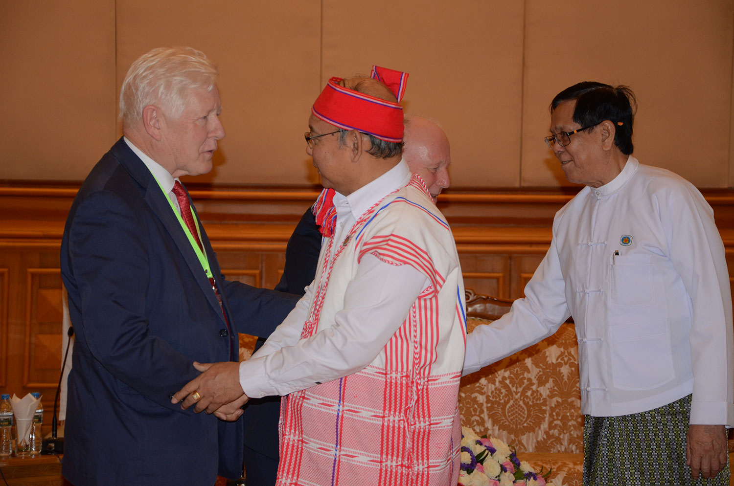 Georg Milbradt, Chairman of Board, and Hon. Bob Rae, Forum Fellow, meeting with Mahn Win Khaing Than, the Speaker of the House of Nationalities, to discuss Federalism.