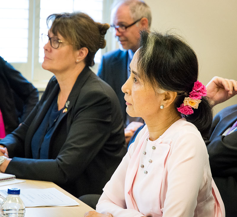 Sessions of high interest to the delegation included panels on Canadian diversity, Canadaโs justice system, and Canadaโs management of security and policing. So important are these subjects for Myanmar that Daw Aung San Suu Kyi herself joined the delegation at these sessions to learn from Canadaโs experiences.